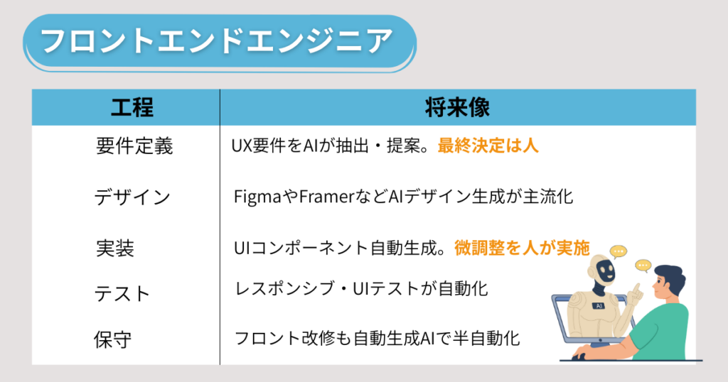 FigmaやFramerなどの生成AIツールが、デザイン案を自動生成し、UIコンポーネントを即座にコード化できるようになっています。そのため、開発者はAIが作った土台を微調整する役割へとシフトしていくと予想されます。