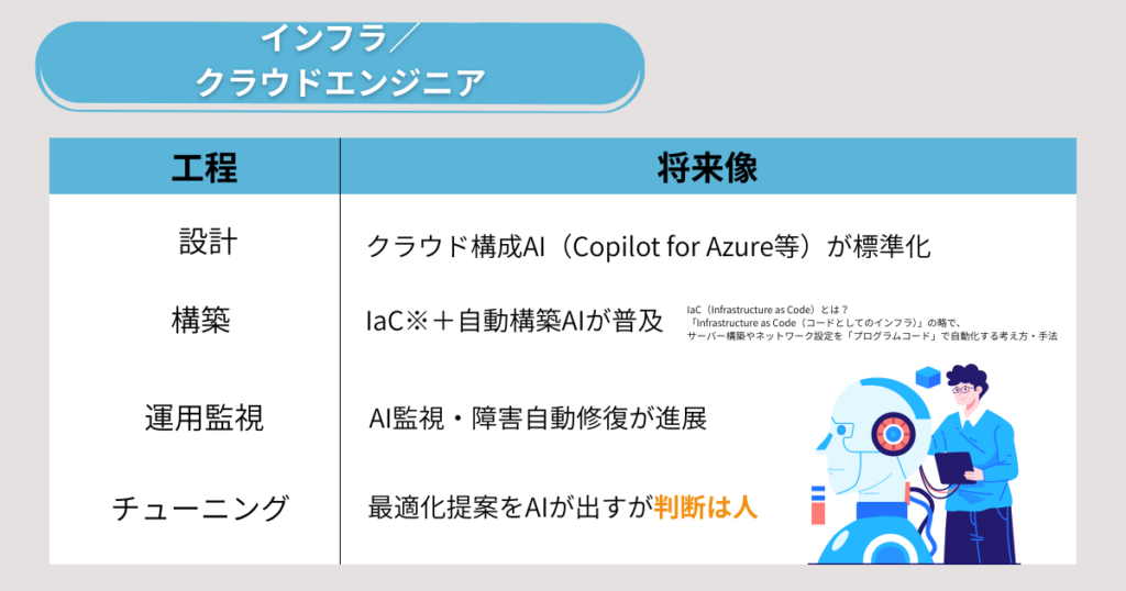 そうなれば障害検知やリソース最適化もAIが担うようになり、人間はセキュリティ判断や設計意図の精査といった上流判断に集中していく流れが加速していくと考えられます。