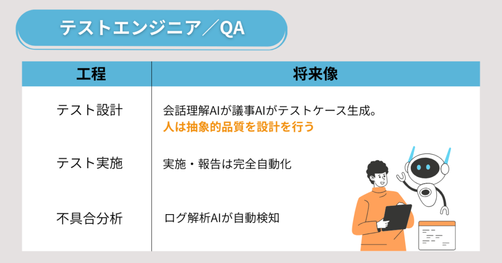 テストエンジニア/QAは、ソフトウェアの品質を守る最終ラインとして、テスト設計・実施・不具合分析を担当する職種です。この分野ではAI化の進行が特に顕著で、仕様書をもとにAIが自動でテストケースを生成し、テストの実行や結果報告までを自動で行う仕組みが普及しつつあります。