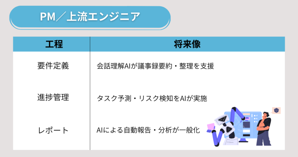 AIの活用場面としては、会話理解AIが打ち合わせ内容を要約・整理し、要件定義のドキュメント化を自動支援するといった形が考えられます。進捗管理では、AIがスケジュールの遅延予測やリスク検知を行い、プロジェクトの健全性をリアルタイムで可視化できるようになる可能性もあります。