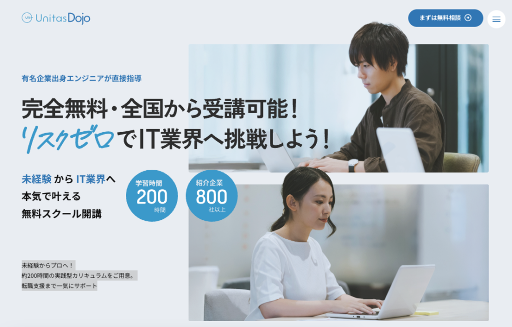 単にスキルを教えるのではなく、「転職成功まで伴走する」運営体制が特徴。200時間を断片的に学ぶのではなく、目的意識を持って積み上げるからこそ、手応えと成長実感を得られる——それがUnitas Dojoの最大の魅力です。