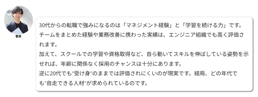 一方で30代に入ると、「マネジメント・リーダー経験」と「継続的な学習」が両立している人材が強みを発揮します。特に30代後半では、過去のキャリアで培ったビジネススキルに加え、最新技術へのキャッチアップ姿勢を示せるかが重要です。
