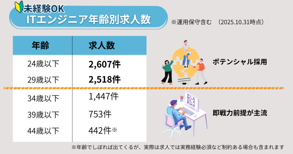 未経験からエンジニアを目指す場合、求人のボリュームゾーンは明確に「20代〜30代前半」に集中しています。前述したデータでも、24歳以下・29歳以下では求人数が2,000件を超える一方、30代半ばを境に急激に減少しています。実際、多くの企業が「未経験可」としながらも、内部的には“32歳以下まで”を目安にしているケースが少なくありません。