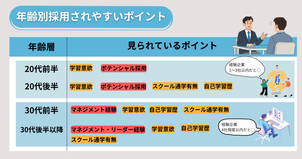 採用の観点から見た、企業が求めるポイントが年齢によって明確に変化していることがわかります。20代前半では「ポテンシャル」や「学習意欲」が最重視され、実務経験よりも“伸びしろ”を評価されます。20代後半になると、学習意欲に加えて「自己学習歴」や「スクール受講実績」が問われ、「実際に手を動かしているか」が採用判断のカギになります。
