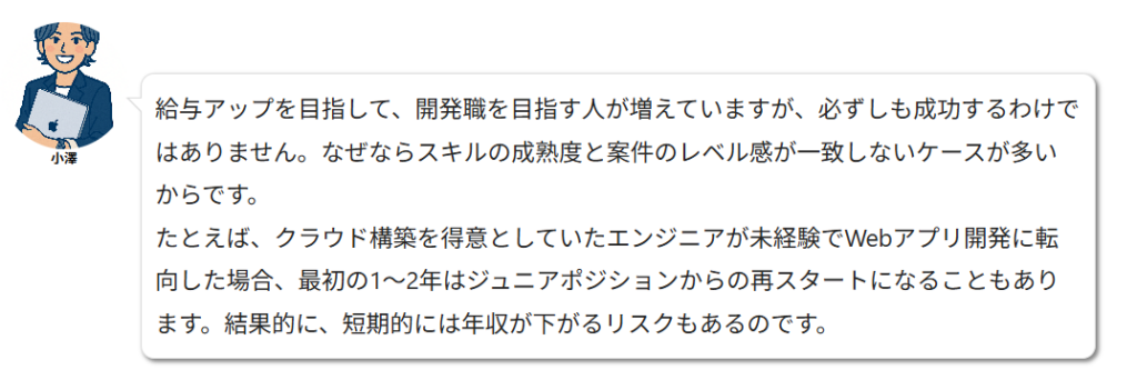 しかし、職種チェンジ直後は“未経験扱い”となり、一時的に年収が下がるケースも少なくありません。特にインフラや運用系から開発職へ移る場合、現場で通用する実務スキルを身につけるまでに時間がかかるのが実情です。