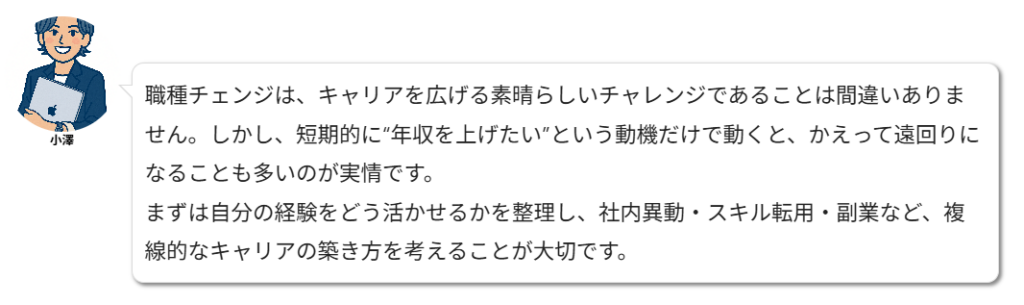 年収を上げる手段として「職種を変える」という手段を検討する人も多いですが、実際には「何を軸にキャリアを積んできたのか、という一貫性」こそが、採用側から最も評価されるポイントといえます。