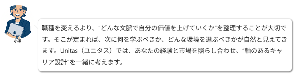 「開発へ行くべきか・インフラで伸ばすべきか」を個別に相談可能です。ユニタスでは、AI・クラウド時代を見据えた“あなたにとって最短で市場価値を上げるルート”を一緒に設計します。
