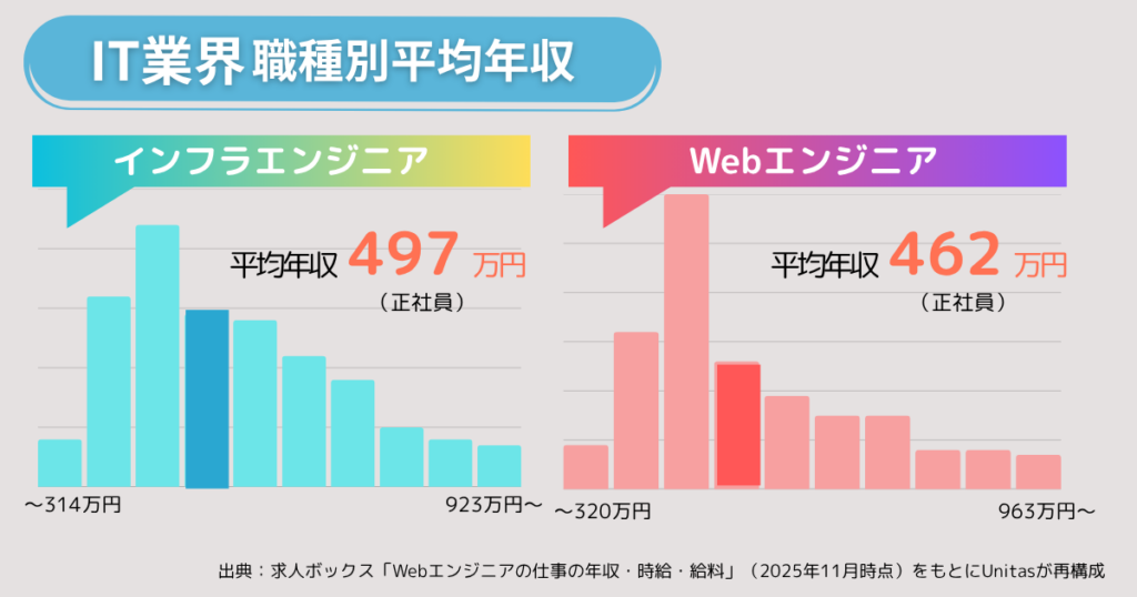 ※出典:求人ボックス「インフラエンジニアの仕事の年収・時給・給料」「Webエンジニアの仕事の年収・時給・給料」(2025年10月時点)をもとにUnitasが再構成
