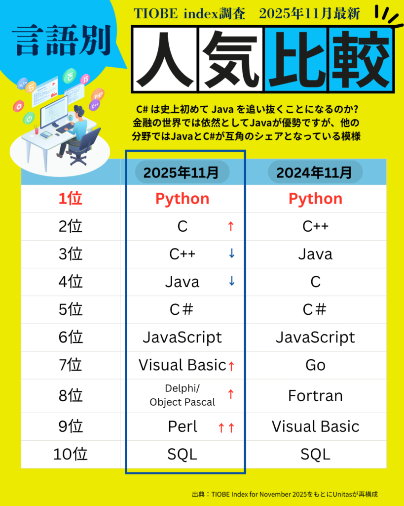 出典:2025年11月のTIOBE指数 ※プログラミング言語の人気動向は、TIOBE index(2025年11月時点)の順位を参照。