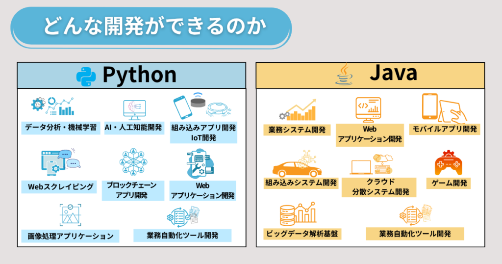 例えば、アプリやWebサービスを安定して運用したい、金融・行政・企業向けのシステム開発に関わりたいならJava。一方で、AI・データ分析・自動化など、新しいテクノロジーに携わりたいならPythonがおすすめといえます。
