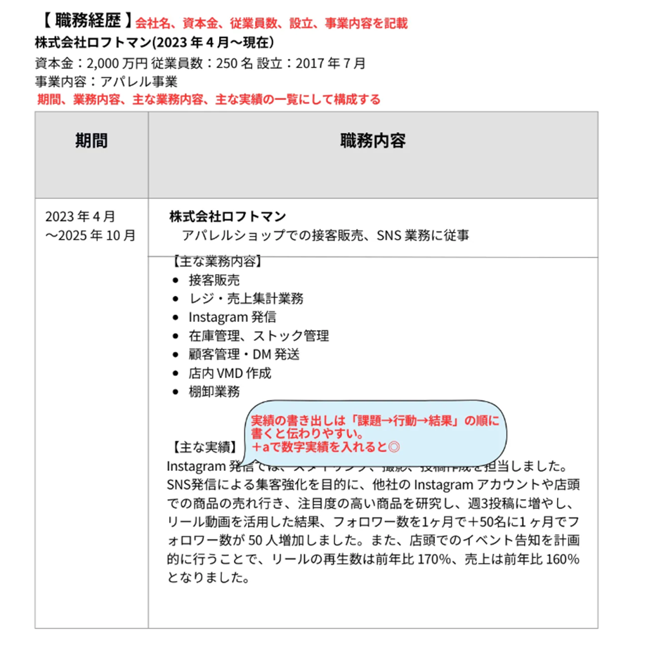 【職務経歴】「会社情報 → 業務 → 実績」の順で書く