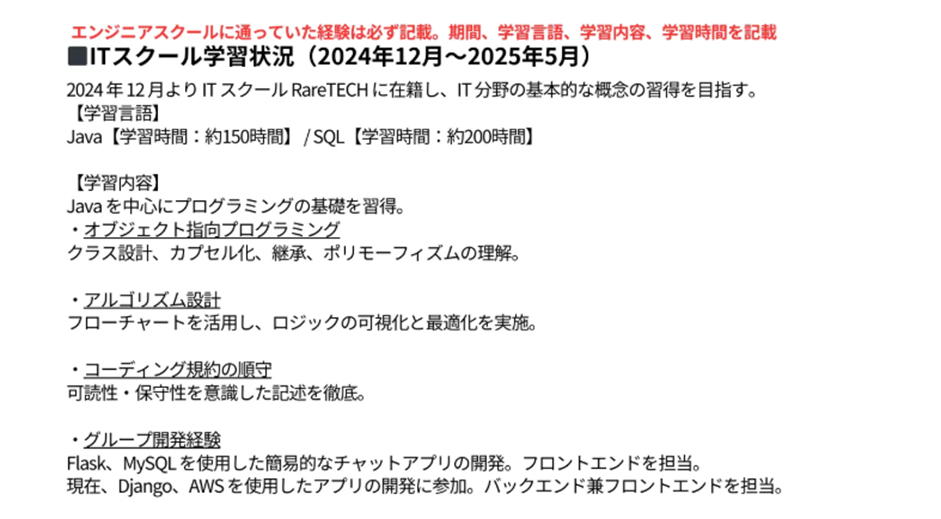 スクール経験で書くべき内容は明確です。受講期間、学習した言語、具体的な学習内容、そして学習時間は必ずセットで記載しましょう。たとえば「6か月間、平日夜と休日を使って学習」「総学習時間〇〇時間」など、時間の投下量を数字で示すと説得力が高まります。