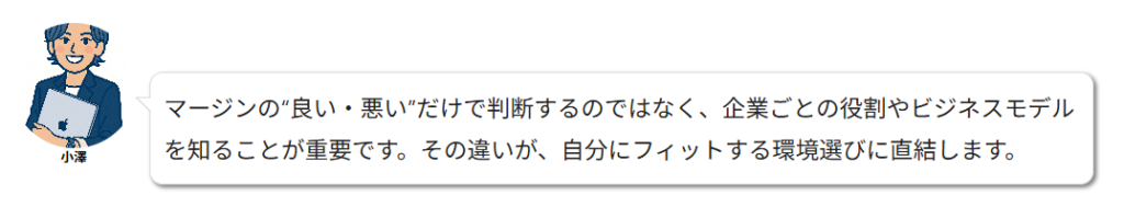 マージンの大小だけでなく、会社が提供する環境や支援の内容を見極めることで、キャリアの軸を見失わずに自身の希望にあった選択をしやすくなります。