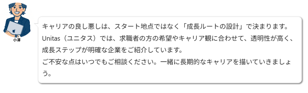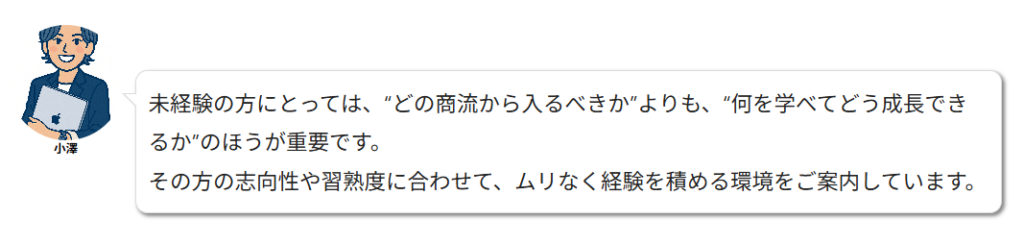 重要なのは「どこから始めるか」ではなく、「どう成長できる環境があるか」です。具体的には、成長ルートが明確に示されているか、評価基準がわかりやすいか、教育サポートが整っているかを見極めること。